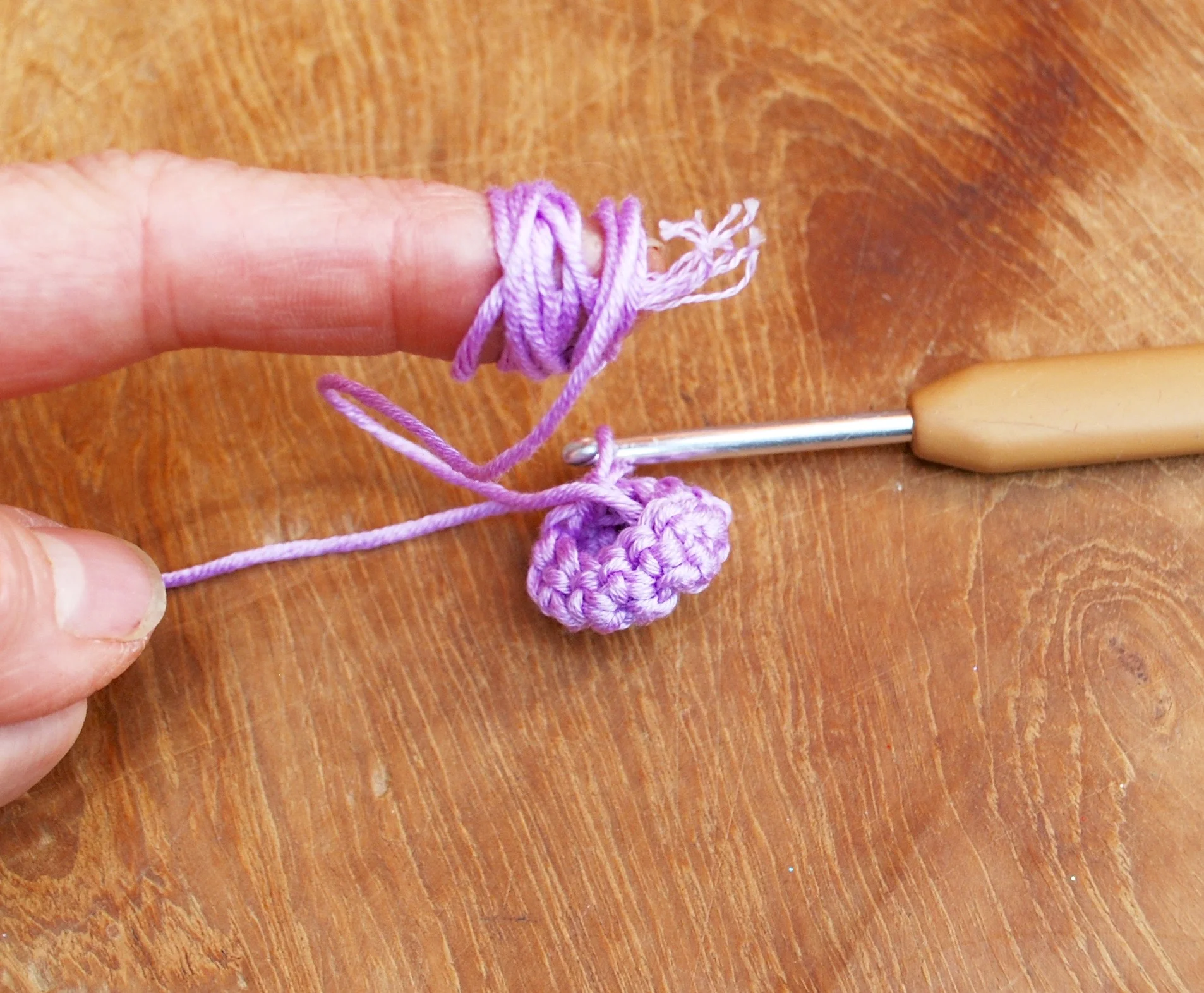 Begin by making a magic loop and making sure that you have an extra long tail (about an arms length) because we will be using it as stuffing.
